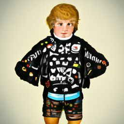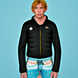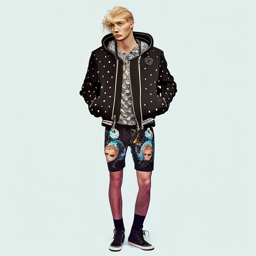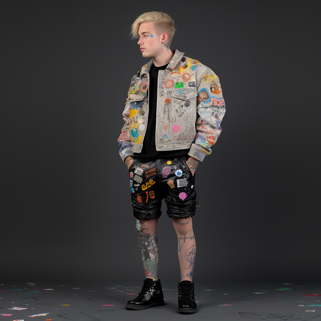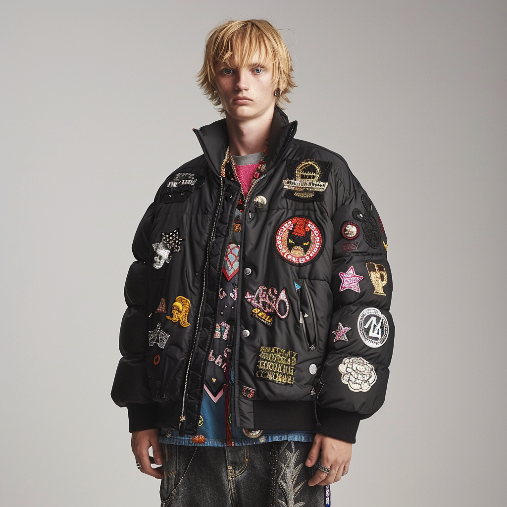 studio fashion editorial, androgynous young blond boy model, shaggy layered haircut, oversized black puffer bomber jacket fully covered with embroidered patches and badges (fictional symbols), layered colorful graphic top with pink accent, distressed dark denim, minimal jewelry, neutral serious gaze, seamless studio backdrop, softbox lighting, subtle rim light, premium lookbook photo, crisp details, realistic skin texture, clean grading, centered framing