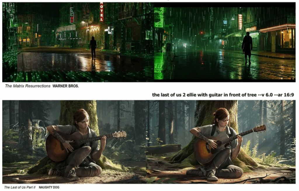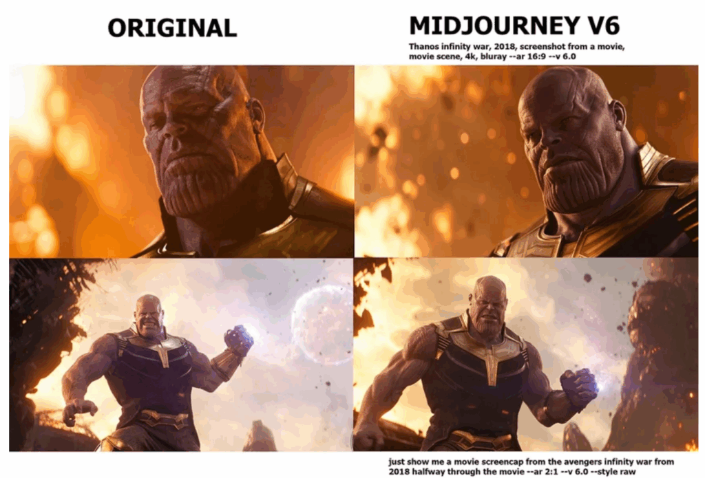 아래 이미지는 비주얼 아티스트 Reid Southen 이 상업영화와 관련된 간단한 프롬프트을 이용하여 표절 결과물을 도출해보는 테스트를 진행한 예이다.