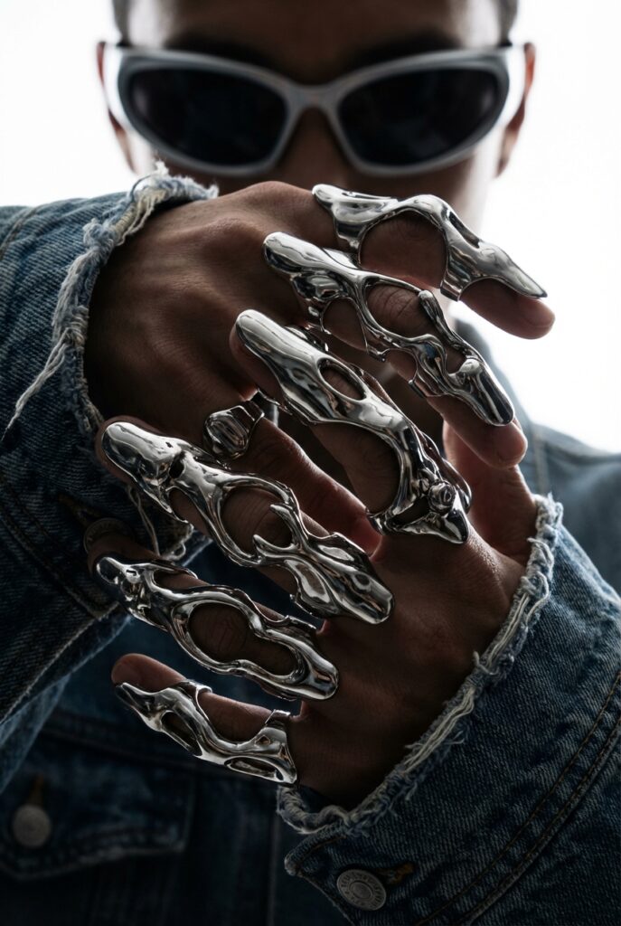 액체 금속처럼 흐르는 크롬 링은 손을 ‘장식’이 아니라 구조물로 보이게 합니다.