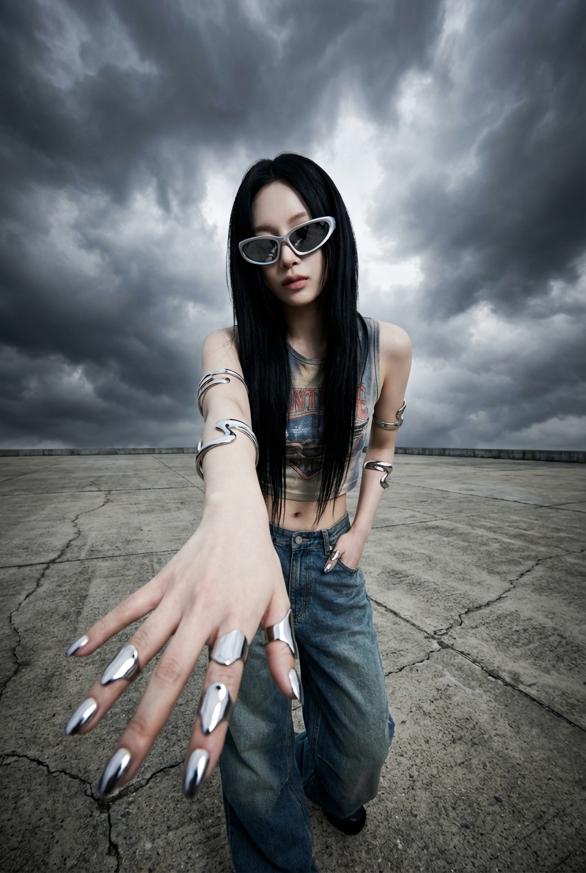A high-fashion outdoor editorial set in a vast empty concrete plaza under massive surreal storm clouds, futuristic Y2K cyber-chic metallic core aesthetic, Korean K-pop idol with pale porcelain skin and long sleek black hair, wearing a faded early-2000s vintage cropped tank top and ultra-wide low-rise denim pants, liquid chrome finger armor and silver arm cuffs, Gentle Monster–style futuristic sunglasses, extreme low-angle worm’s-eye view, 24mm wide-angle lens, exaggerated perspective distortion, one hand reaching toward the camera as the main foreground subject, extreme high-contrast backlighting from the cloudy sky, powerful rim light outlining the silhouette, sharp chrome reflections, minimal front fill light, dramatic cinematic contrast, vertical composition, ultra-detailed, 8k