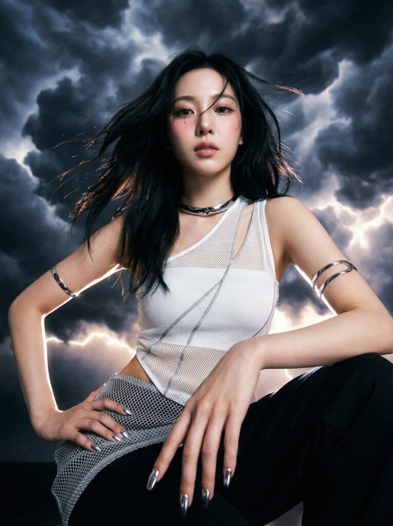 A minimalist high-fashion portrait set against surreal dark thunderclouds forming a dramatic backdrop, futuristic Y2K cyber-chic metallic core aesthetic, Korean female idol, luxury K-pop lookbook style, wide lens, dutch angle top view